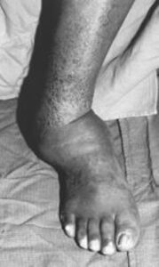 (Left) This patient with Charcot of the ankle has developed a deformity that places abnormal pressure on the outside of the ankle. (Right) This pressure has led to the development of a chronic sore (ulcer) that can be extremely difficult to treat.