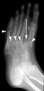 The patient shown in the X-ray had noticed swelling of the foot for approximately 3 weeks without any known injury. The X-ray shows several fractures (arrowheads) and a dislocation of the first metatarsal (arrow). Such a severe injury in patients without diabetes would be seen only after a high-energy trauma.