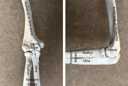 The elbow joint is formed by three bones: the humerus in the upper arm and the radius and ulna in the forearm. Each of these bones has a distinct shape, and ligaments connect them to maintain proper alignment and joint stability.