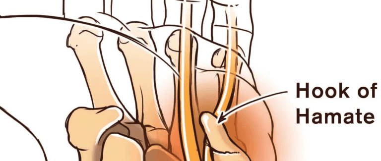 Careful surgical dissection is required to identify the hook projection and protect the nearby all that nerve and long flexor tendons to the little finger.