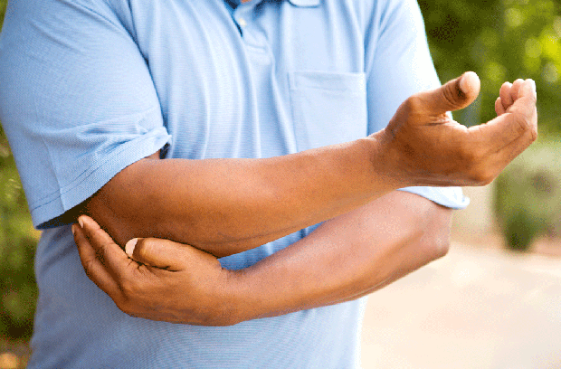 Both of these symptoms may not occur at the same time. Patients usually report a “grating” or “locking” sensation in the elbow. The “grating” is due to the loss of the normal smooth joint surface. This is caused by cartilage damage or wear.