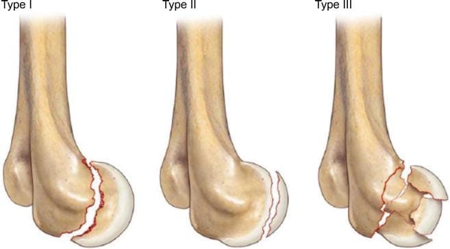 - Type 4: Coronal shear fractures involving both the capitellum and a portion of the trochlea (another part of the elbow joint).
