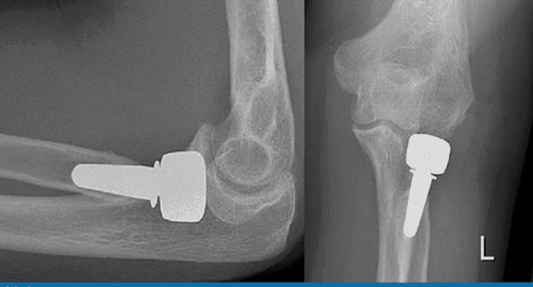Postoperative short-term follow-up is important for checking on wound healing and preventing acute infections. In a 6- to 8-week period of functional rehabilitation, patients generally have fair success at pursuing activities of daily living. Long-term follow-up is important to monitor chronic problems, such as implant loosening, and systemic disease, such as rheumatoid arthritis. Especially in unlinked arthroplasties, polyethylene bushing or inlay wear and metal wear of the humeral and/or ulnar prosthesis pose a problem, because the articulating surfaces are larger than in linked designs; unlinked models have a large articulating area and not only a small hinge surface. As such, taking a patient history, physically examining the patient’s elbow for range of motion and stability, and having the patient complete a standardized questionnaire on elbow function using the patient-reported outcome measures are now routine care.