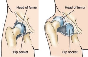 (Left) In a normal hip, the head of the femur fits firmly inside the hip socket. (Right) In severe cases of DDH, the thighbone is completely out of the hip socket (dislocated).