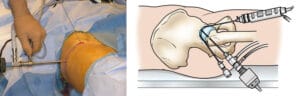 (Left) During arthroscopy, your surgeon inserts an arthroscope through a small incision about the size of a buttonhole. (Right) Other instruments are inserted through separate incisions to treat the problem.